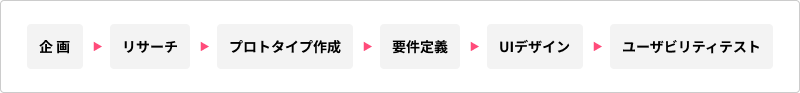 企画→リサーチ→プロトタイプ作成→要件定義→UIデザイン→ユーザビリティテスト(プロジェクトの内容や状況によってプロセスは変動します。)