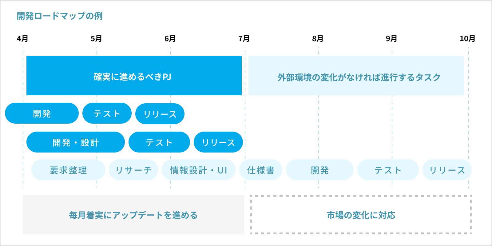 - 先の3ヶ月(7月〜9月):外部環境の大きな変化がなければ進行するタスクを計画し、要件定義前の要求整理やリサーチに着手する