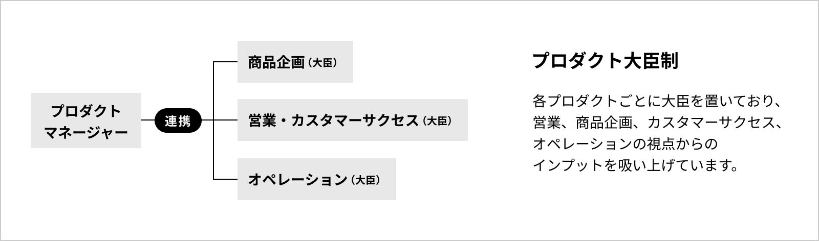 各プロダクトにおいて、「商品企画部」「営業部(・カスタマーサクセス)」「オペレーション部」それぞれの部署から1〜2名がプロダクト大臣として任命され、任命された大臣たちは、定期的な「大臣会」という会議を通じて、各部署・部門の視点から意見集約や情報交換を行なっています。