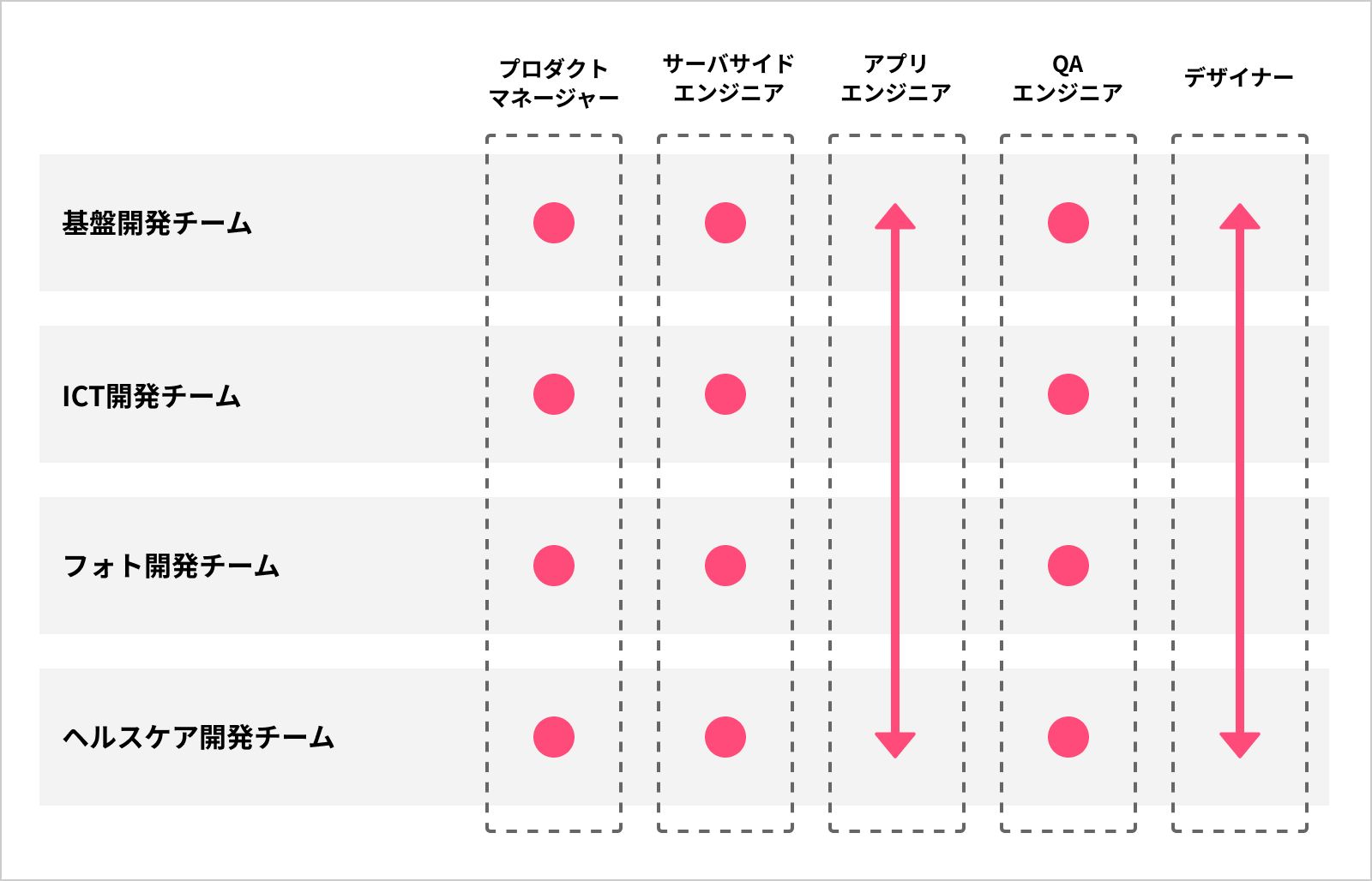 プロダクトチームは全部で4つあり、それぞれにプロダクトマネージャーが所属しています。各チームにはサーバサイドエンジニアとQAエンジニアが配属されており、チームを横断する形でアプリエンジニアとデザイナーが協力し、日々プロダクトの開発を進めています。